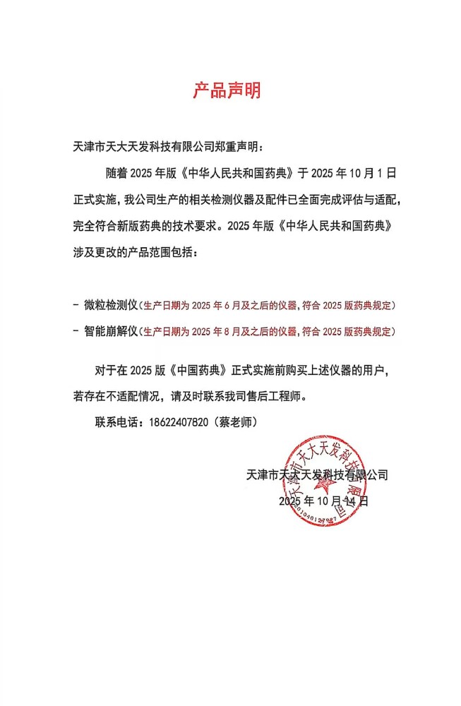 聲 明鑒于2025版《中國藥典》的更新,為保障天大天發(fā)忠實用戶的切身利益,凡在2025年之前購置我公司設備的客戶,若您的設備未能滿足新版藥典的要求,我們將提供升級服務。涉及產品:微粒檢測儀:GWJ-1···...